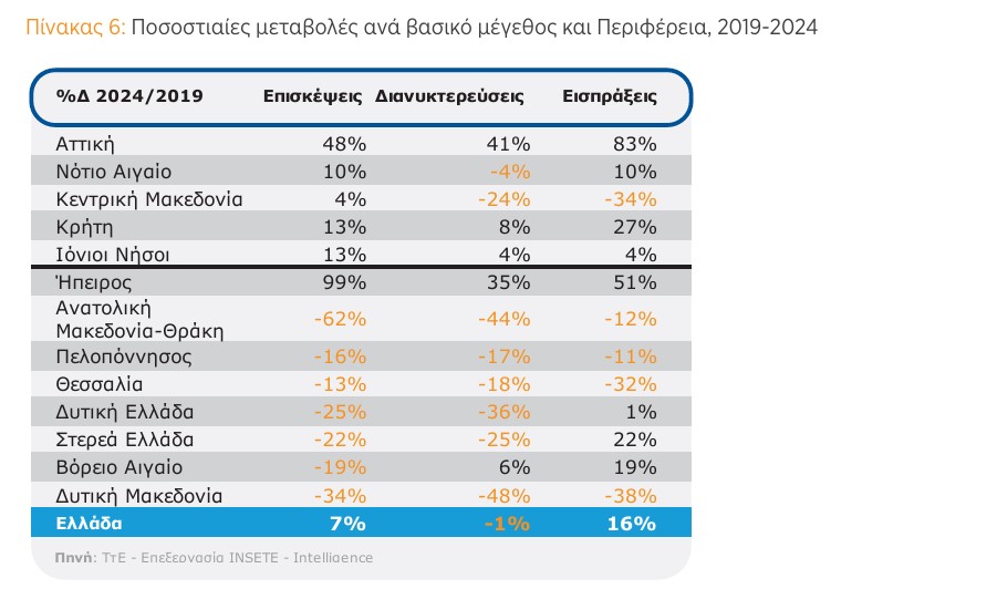 Οι μεταβολές στις Επισκέψεις, Διανυκτερεύσεις και Εισπράξεις, κατά το διάστημα 2019-2024, είναι αυτές: