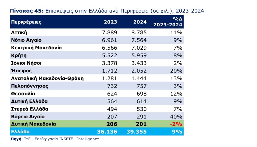 Η Δυτική Μακεδονία είναι η μοναδική περιφέρεια που εμφανίζει αρνητικό ποσοστό (διαφορά 2023-2024)! Κατέχοντας το 0% στην ποσοστιαία κατανομή των επισκέψεων στην Χώρα ανά περιφέρεια.