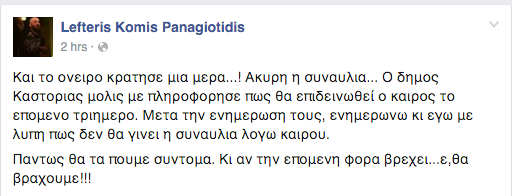 Και το ονειρο κρατησε μια μερα…! Ακυρη η συναυλια… Ο δημος Καστοριας μολις με πληροφορησε πως θα επιδεινωθεί ο καιρος το επομενο τριημερο. Μετα την ενημερωση τους, ενημερωνω κι εγω με λυπη πως δεν θα γινει η συναυλια λογω καιρου.