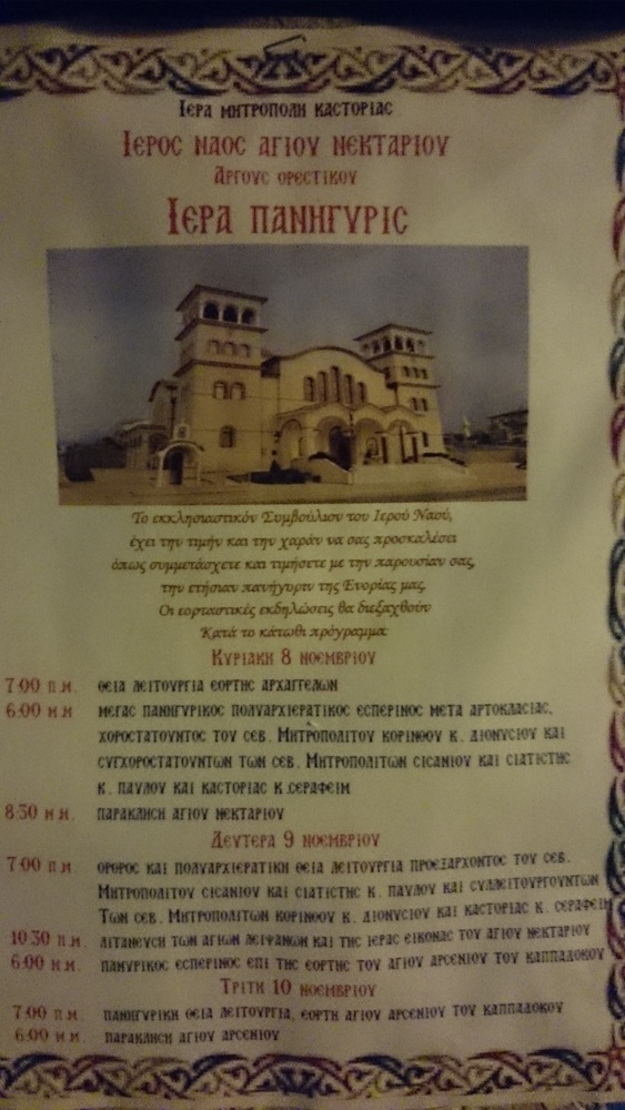 Σήμερα στις 18:00 ο Πανηγυρικός Πολυαρχιερατικός εσπερινός στον Ιερό Ναό του Αγίου Νεκταρίου στο Άργος Ορεστικό, ενώ αύριο το πρωί η Θεία Λειτουργία και η Λιτάνευση των Αγίων Λειψάνων και της ιεράς εικόνας του Αγίου Νεκταρίου.