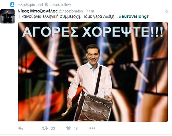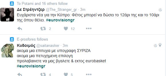 #ViralΕλλάδα Δεν πέρασε στον τελικό της Eurovision η Ελλάδα – θρίαμβος για την Κύπρο 11/05/2016 Χρυσούλα Κυρατζή Μετά από μία μάλλον μέτρια εμφάνιση στον Α’ Ημιτελικό της Eurovision, η χώρα μας δεν κατάφερε να εξασφαλίσει μία από τις 10 θέσεις του μεγάλου τελικού του Σαββάτου. Χιουμοριστικά μηνύματα στο Twitter για την εμφάνισή μας… Μοιραστείτε αυτό το άρθρο:Comments comments