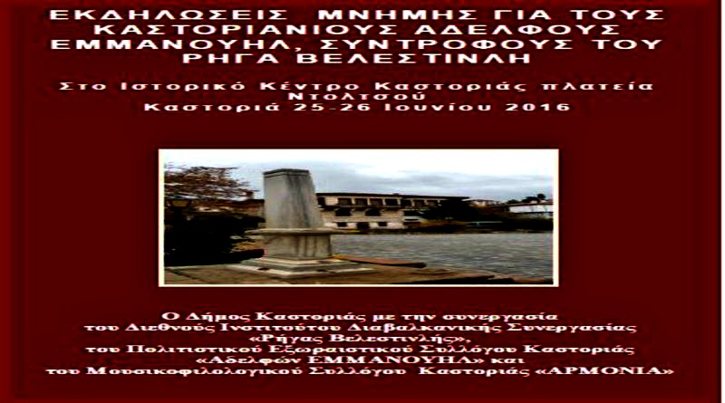 Σας προσκαλούμε να τιμήσετε με την παρουσία σας τις εκδηλώσεις τιμής και μνήμης για τους Καστοριανούς Αδελφούς Ιωάννη και Παναγιώτη Εμμανουήλ, Συντρόφους του Ρήγα Βελεστινλή.