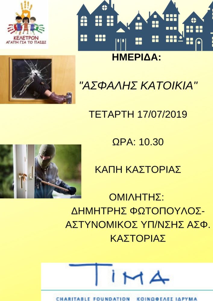 Την Τετάρτη 17 Ιουλίου 2019 ο οργανισμός μας «Κέλετρον Αγάπη για το Παιδί» θα πραγματοποιήσει στις 10:30 π.μ., στο ΚΑΠΗ Καστοριάς, ημερίδα με θέμα «Ασφαλής Κατοικία». Το θέμα θα αναλύσει ο κος. Φωτόπουλος Δημήτριος Αστυνομικός της Υποδιεύθυνσης Ασφαλείας Καστοριάς.