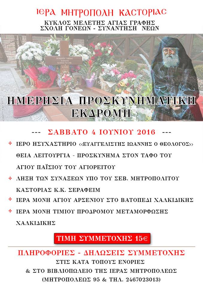 Ιδέες για αποδράσειςΚαστοριά Ημερήσια προσκυνηματική εκδρομή στον τάφο του Αγίου Παϊσίου 02/06/2016 Χρυσούλα Κυρατζή Ημερήσια προσκυνηματική εκδρομή στον τάφο του Αγίου Παϊσίου του Αγιορείτου διοργανώνει η Ιερά Μητρόπολη Καστοριάς το Σάββατο 4 Ιουνίου. Κόστος συμμετοχής 15€ Το πρόγραμμα και πληροφορίες – δηλώσεις συμμετοχής: Μοιραστείτε αυτό το άρθρο:Comments comments