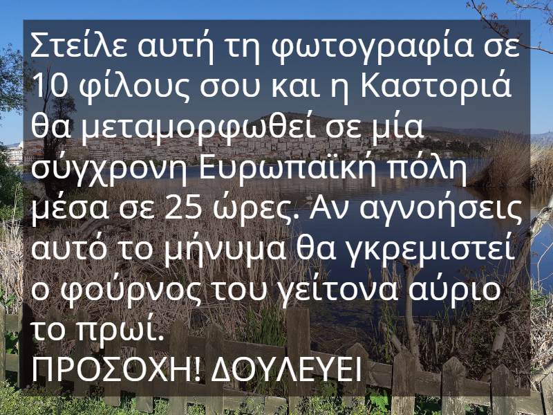Δεν επιτρέπω στην Καστοριά να μετατραπεί σε μια πόλη γερόντων που δεν επιτρέπουν καμία εκδήλωση μετά τις 11 το βράδυ και δεν υπάρχουν δουλειές για επιστήμονες. Με την κοινοποίηση αυτή δηλώνω ενεργός υποστηρικτής της πόλης, των ανθρώπων, της λίμνης, της τοπικής αγοράς, των ραγκουτσαριών και των κύκνων.