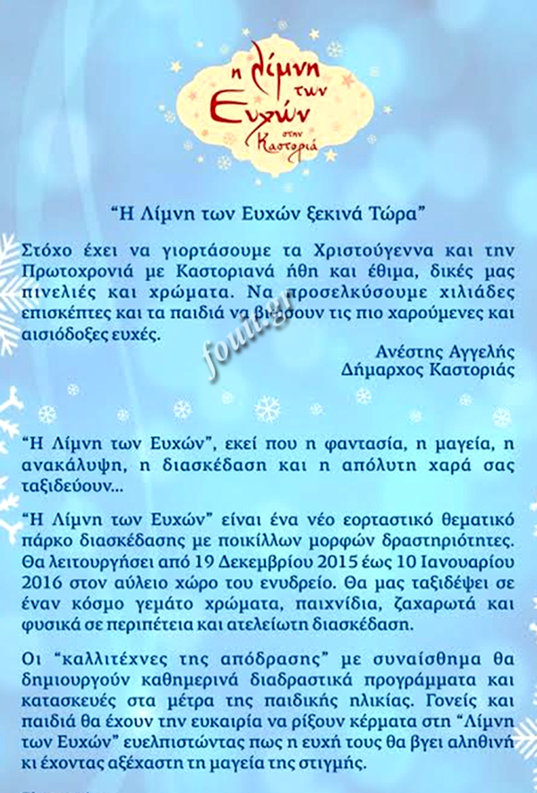 ΚαστοριάΣυμβαίνει στην πόλη «Λίμνη των Ευχών»: Αναλυτικό πρόγραμμα εκδηλώσεων 07/12/2015 AboutKastoria Μια μεγάλη σειρά εκδηλώσεων στο πλαίσιο του χριστουγεννιάτικου πάρκου «Λίμνη των Ευχών» παρουσίασαν σήμερα σε συνέντευξη τύπου ο Δήμαρχος Καστοριάς κ. Ανέστης Αγγελής και ο Αντιδήμαρχος κ Δημήτρης Κωτούλας. fouit.gr Μοιραστείτε αυτό το άρθρο:Comments comments