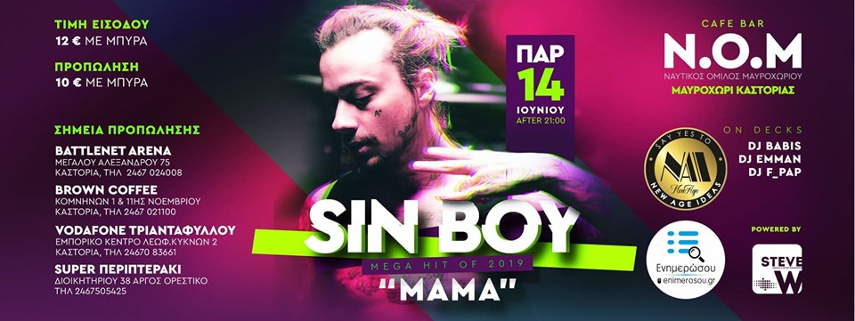 O Sin Boy, ο πιο ανερχόμενος και πιο αγαπητός ράπερ, γνωστός για τις μεγάλες επιτυχίες “Mama” και “Gigi” που έχουν ξεπεράσει μέσα σε ελάχιστο χρονικό διάστημα τις 20 εκατομμύρια προβολές στο YouTube, σπάζοντας κάθε ρεκόρ στην ελληνική μουσική, έρχεται για πρώτη φορά στο Μαυροχώρι Καστοριάς!!!!