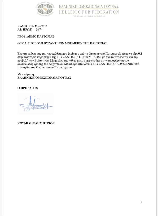 Ακολούθησε το αίτημά μου προς την Ελληνική Ομοσπονδία Γούνας για την παραχώρηση χρήσης του Αρχοντικού προς την «Βυζαντινή Οικουμένη». Η Ε.Ο.Γ. ανταποκρίθηκε άμεσα, αναγνωρίζοντας την σπουδαιότητα του παραρτήματος και δέχτηκε την παραχώρηση της χρήσης. (Έγγραφο 1)