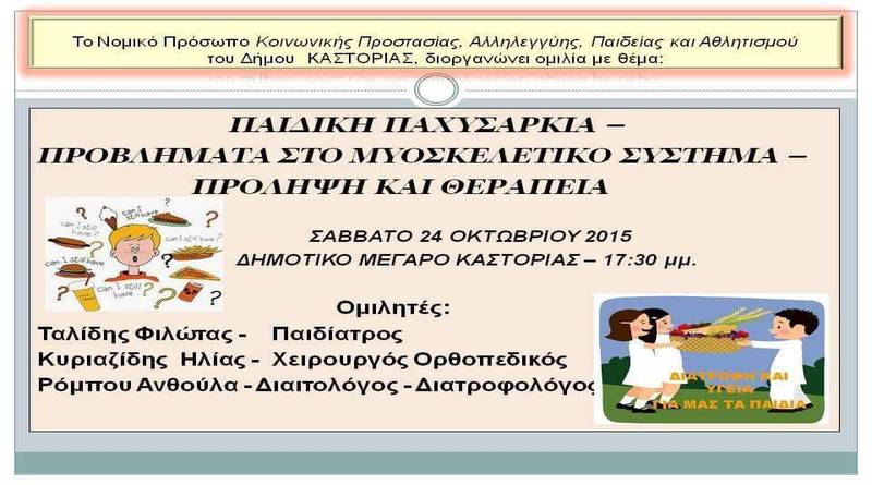 Το Σάββατο 24 Οκτωβρίου 2015 στις 17:30 ο Δήμος Καστοριάς σας προσκαλεί σε μία πολύ ενδιαφέρουσα ομιλία με θέμα: “Παιδική Παχυσαρκία – Προβλήματα στο Μυοσκελετικό Σύστημα – Πρόληψη και Θεραπεία” στο Δημοτικό Μέγαρο Καστοριάς.