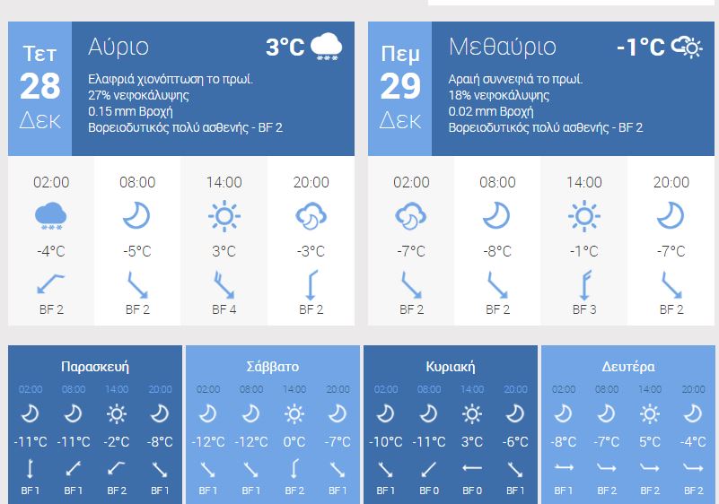 Συγκεκριμένα, όπως αναφέρει το δελτίο, «επιδείνωση θα παρουσιάσει ο καιρός από αύριο (σ.σ.: Τετάρτη 28 Δεκεμβρίου), με κύρια χαρακτηριστικά τις πυκνές κατά τόπους χιονοπτώσεις ακόμα και σε πεδινές περιοχές κυρίως της ανατολικής χώρα, τους θυελλώδεις βοριάδες 8-9 μποφόρ στα πελάγη και τη σημαντική πτώση της θερμοκρασίας».