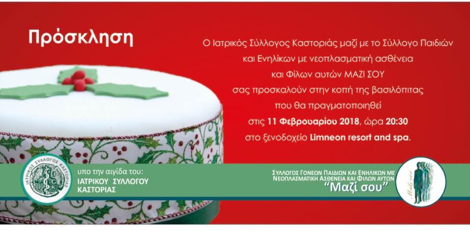 ΚαστοριάΣυμβαίνει στην πόλη Σήμερα η κοπή της βασιλόπιτας του “Μαζί Σου” και του Ιατρικού Συλλόγου Καστοριάς 11/02/2018 Χρυσούλα Κυρατζή Ο Ιατρικός Σύλλογος Καστοριάς και ο Σύλλογος “Μαζί Σου” σας προσκαλούν στην κοπή της βασιλόπιτας, σήμερα 11 Φεβρουαρίου στο Ξενοδοχείο Limneon. Στις 20.30! Μοιραστείτε αυτό το άρθρο:Comments comments