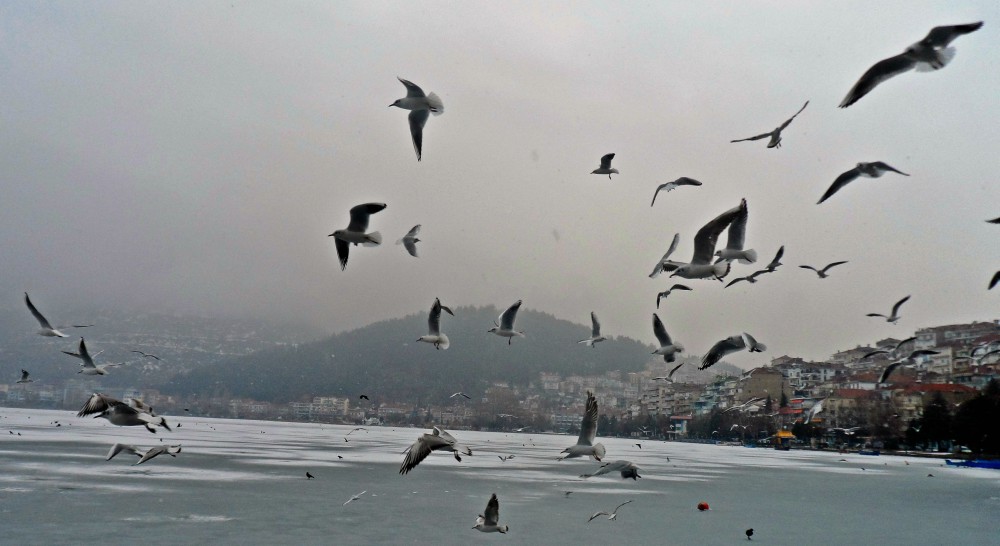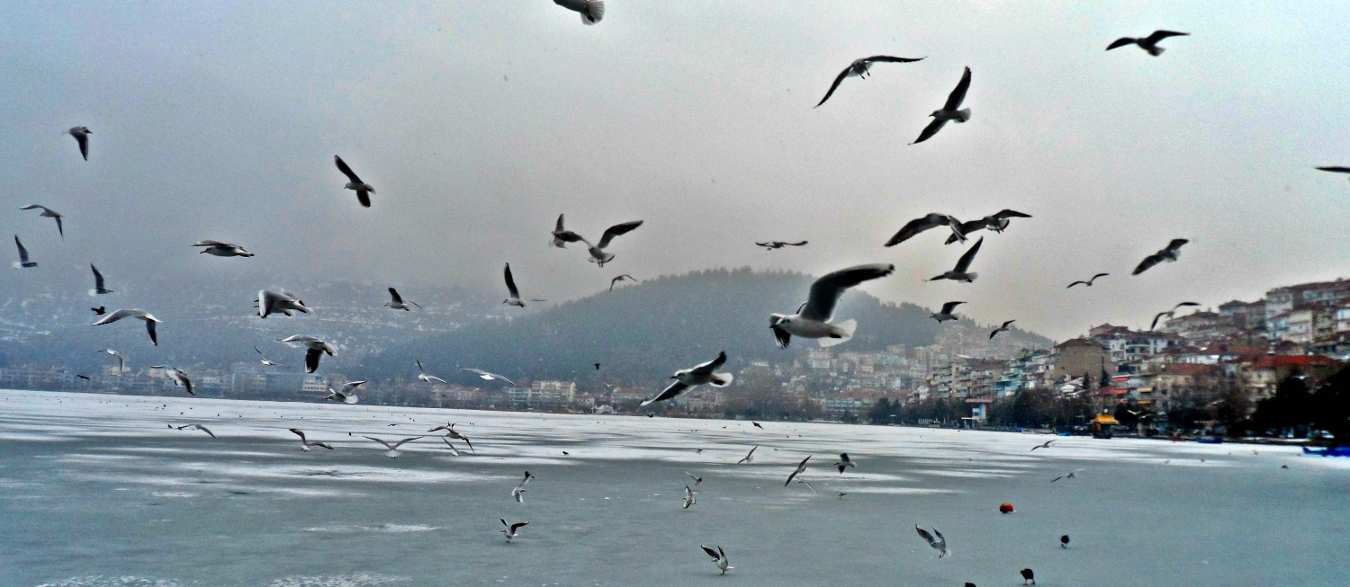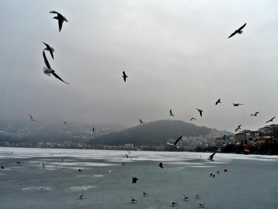 Μετά από μισή ώρα μαγευτική περιπλάνηση στην παραλία, βρεθήκαμε στο κέντρο συνάντησης εκατοντάδων πτηνών της λίμνης…Αντιλήφθηκαν τις σακούλες από πολύ μακριά…